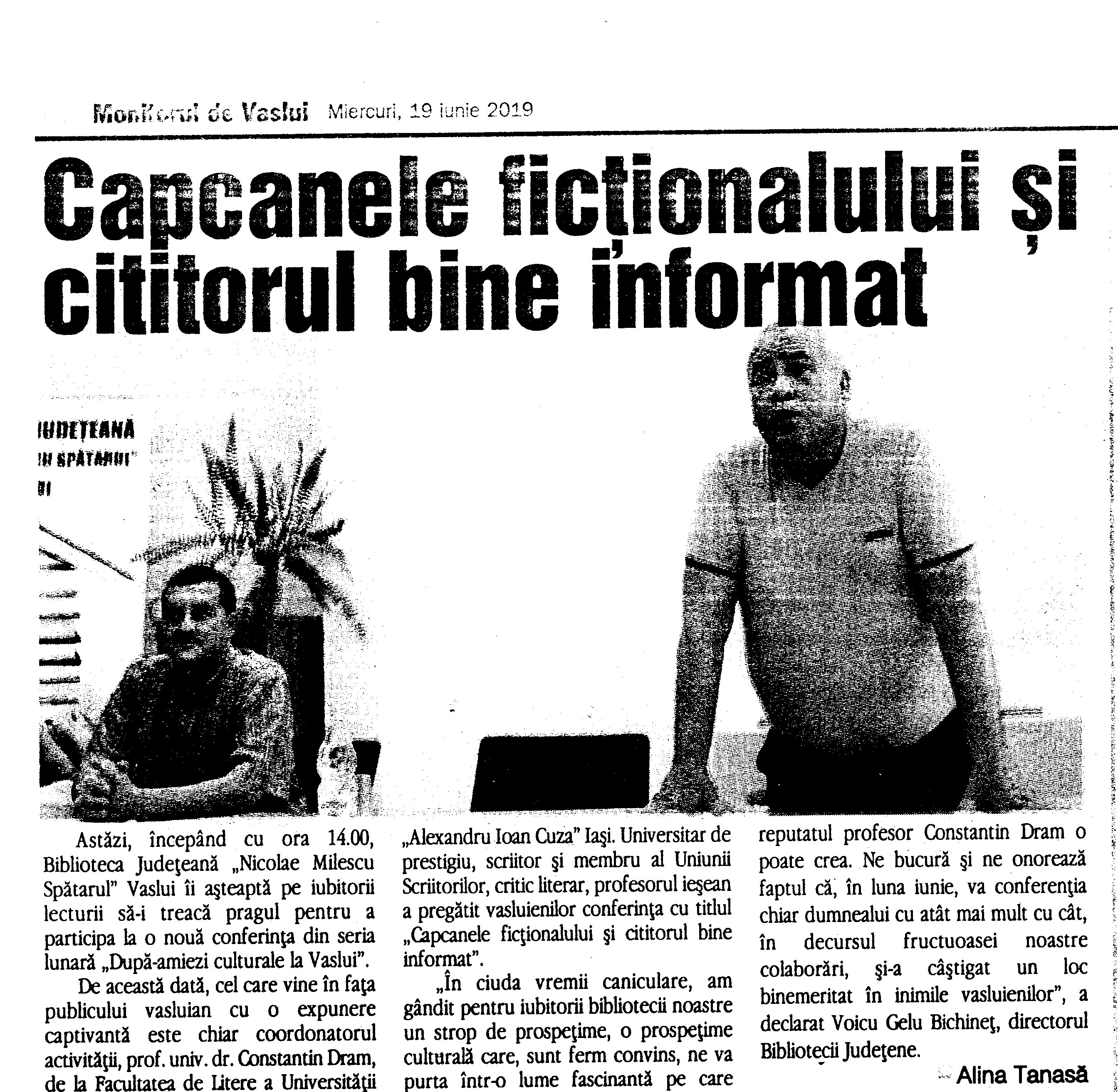 2018-11-06 - Monitorul de Vaslui - Despre Mihail Sadoveanu, la Biblioteca Judeteană Vaslui2018-11-06 - Realitatea de Vaslui - După-amiezi culturale la Bibliotecă: Sadoveanu, omagiat la 138 de ani de la naștere2018-10-30 - Vremea Nouă - Vasluienii au aflat detalii despre ''Pactul Ribbentrop-Molotov'' în cadrul ''După-amiezilor culturale''2018-10-29 - Realitatea de Vaslui - Invitație la întâlnire cu istoria2018-10-29 - Vremea Nouă - ''După-amiezi culturale'' în Vaslui, alături de academicianul Valeriu Matei2018-10-23 - Vremea Nouă - Tinerii și pensionarii, de vorbă despre ''job''-uri2018-10-12 - Est News - Jandarm vasluian, premiat la Festivalul Umorului ''Constantin Tănase''2018-10-11 - Vremea Nouă - Poiană Vlad, jandarmul poet2018-10-10 - Vremea Nouă - Concurs de creație literară la Biblioteca Judeteană ''Nicolae Milescu Spătarul'' Vaslui2018-10-08 - Meridianul de Vaslui - Festivalul Umorului...2018-10-08 - Meridianul de Vaslui - Simpozionul Național ''Presa locală și cultura națională'', Vaslui