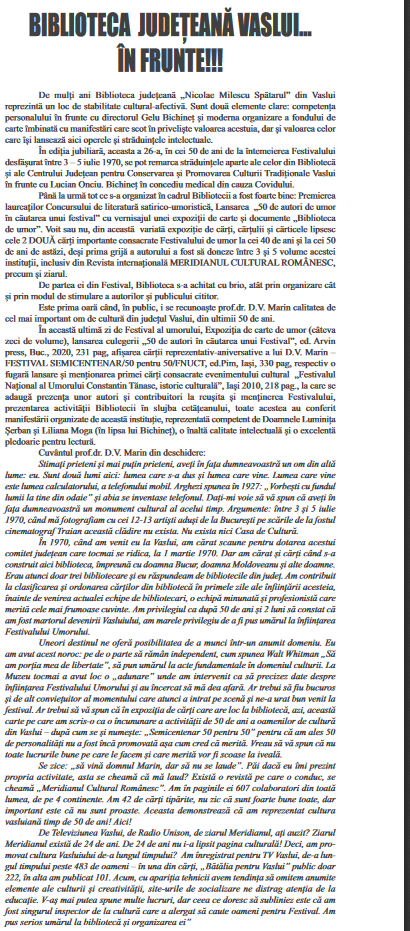 realizată de Biblioteca Județeană Vaslui2020-10-01 - Meridianul de Vaslui - Festivalul umorului la aniversarea de 50 de ani - confiscat de pandemie și nulități2020-09-24 - Meridianul de Vaslui - Am strâns toamnă după toamnă, dar și ediție după ediție, 50 de ani, la FNUCT2020-09-24 - Meridianul de Vaslui - Biblioteca Județeană Vaslui... în frunte!!!2020-09-21 - actualVS.ro - A fost lansată cartea "50 de autori în căutarea unui Festival"2020-09-21 - Vasluianul - S-a tras cortina peste ediția jubiliară a Festivalului Umorului "Constantin Tănase". Cu zâmbete și voie bună, a "la Tănase"!2020-09-21 - Vremea Nouă - Festivalul lui Tănase: o comedie electorală în plină pandemie!2020-09-20 - actualVS.ro - Ei sunt cei mai buni creatori de la Concursul de literatură satirico-umoristică!2020-09-19 - Vasluianul - Am spus "Start" la ediția jubiliară a Festivalului Umorului, de la Vaslui! Prima zi de festival!2020-09-01 - Monitorul de Vaslui - Vaslui - primele evenimente culturale majore de la debutul pandemiei de Coronavirus2020-08-16 - Gazeta de Vaslui - 6 dintr-o... lovitura la Zilele Culturale ale Vasluiului!!2020-08-16 - Gazeta de Vaslui - A doua zi, la fel de bogata ca prima2020-08-15 - actualVS.ro - Vasluiul, în haine de sărbătoare și în timpul pandemiei2020-08-14 - Vremea Nouă - Zilele Vasluiului, în vreme de pandemie: fără grătare si concerte în centrul orasului. Iată, totusi, ce activităti vor avea loc2020-08-13 - Ziarul de Vaslui - Programul Zilelor Culturale ale Municipiului Vaslui2020-08-11 - Vremea Nouă - Vasluienii, invitați la o nouă ediție a Concursului "Europa Literară"2020-08-06 - Gazeta de Vaslui - Evenimente derulate de Biblioteca Județeană cu ocazia Zilelor Vasluiului2020-08-01 - Vasluianul - Vor fi organizate Zilele Vasluiului, dar fără grătare și bere!2020-07-08 - Monitorul de Vaslui - Astăzi, debutează Clubul de vacanță în limba franceză, la Vaslui2020-07-06 - Vremea Nouă - Vasluienii, invitati la Concursul de literatură satirico-umoristică din cadrul Festivalului "C. Tănase"2020-06-28 - Vremea Nouă - Elevii vasluieni, invitati să se înscrie în Clubul de vacanță în limba franceză2020-06-26 - actualVS.ro - Biblioteca Județeană Vaslui va găzdui Clubul de vacanță în limba franceză2020-06-25 - Monitorul de Vaslui - Ce proiecte credeți că sunt prioritare pentru județul Vaslui?2020-06-24 - Monitorul de Vaslui - Vasluienii "fii ai muzelor", invitați să participe la Festivalul Umorului2020-06-17 - Est News - Iubitorii de carte nu dezamăgesc. Peste 100 de utilizatori vin zilnic la Biblioteca Județeană Vaslui2020-06-05 - Monitorul de Vaslui - Biblioteca Județeană nu se predă: Istorie predată online2020-05-19 - Vremea Nouă - Biblioteca județeană, redeschisă pentru cititori2020-03-02 - Vremea Nouă - Concurs: creează identitatea vizuală a Festivalului "Constantin Tănase 50" și vei fi premiat!2020-02-29 - Gazeta de Vaslui - Comemorare Ion Iancu Lefter2020-02-27 - Vremea Nouă - 30 ani de la moartea poetului Ion Iancu Lefter2020-02-26 - Gazeta de Vaslui - Comemorare Ion Iancu Lefter2020-02-24 - Gazeta de Vaslui - Conferința "După-amiezi culturale la Vaslui"2020-02-24 - Monitorul de Vaslui - "Despre gusturi și pofte. Paradoxurile gustului"2020-02-05 - Est News - Cele 70 de biblioteci din județul Vaslui dețin un fond de 1,7 milioane de cărți2020-02-05 - Vremea Nouă - Manifestare culturală la Scoala "Stefan cel Mare"2020-01-30 - Gazeta de Vaslui - Lansari de carte la Biblioteca Judeteana Vaslui2020-01-27 - Gazeta de Vaslui - Lansari de carte la Biblioteca Judeteana Vaslui2020-01-20 - Gazeta de Vaslui - Activitate intensa, in 2019, la Biblioteca Judeteana Vaslui2020-01-14 - Gazeta de Vaslui - "Dupa-amiezi culturale la Vaslui"2020-01-14 - Monitorul de Vaslui - Despre Eminescu, la Biblioteca Judeteana Vaslui2020-01-06 - Vremea Nouă - Concursul Judetean "Mladite literare", o