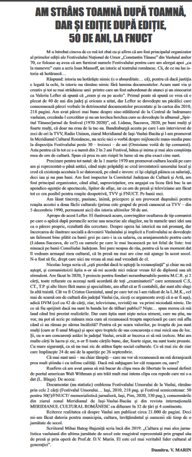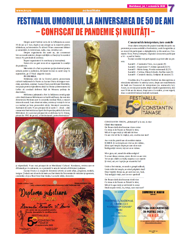 satirico-umoristică a Festivalului ''Tănase''2018-10-01 - Est News - Festivalul Umorului ''Constantin Tănase'', debut fulminant în centrul Vasluiului2018-10-01 - Monitorul de Vaslui - Vasluiul zâmbeste, în umbra marelui Tănase2018-09-28 - Vremea Nouă - 3, 2, 1... Se ridică cortina! Incepe Festivalul Umorului ''Constantin Tănase''2018-09-18 - Monitorul de Vaslui - ''Torentul'' vine la Vaslui2018-09-17 - actualVS.ro - Pentru iubitorii de romane polițiste2018-09-17 - Realitatea de Vaslui - A apărut moda polițiștilor scriitori și la Vaslui2018-09-04 - actualVS.ro - Micromonografia satului Chițoc,